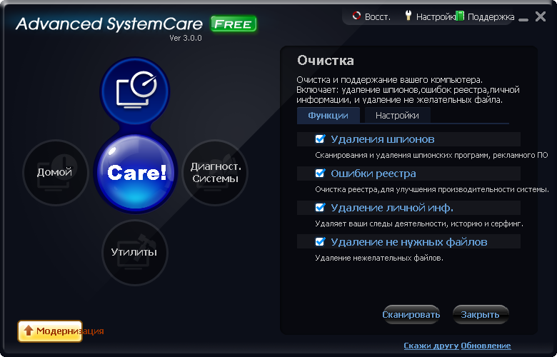 Представляем вашему внимаю обновление бесплатного пакета всевозможных утилит для оптимизации, настройки, исправления ошибок и повышения общей производительности операционной системы Windovs. Программа проводит анализ системы, после чего производит оптимизацию системной конфигурации, в том числе изменяет настройки безопасности на оптимальные, очищает от шпионского и рекламного ПО, исправляет ошибки в системном реестре, удаляет временные и ненужные файлы, а также следы путешествия по интернет, оптимизирует параметры интернет-соединения, производит дефрагментацию жесткого диска и системного реестра, позволяет управлять автозагрузкой и многое другое. Все изменения, внесенные программой Advanced SystemCare в операционную систему, можно вернуть обратно из резервной копии, которая делается при первом запуске программы. | |