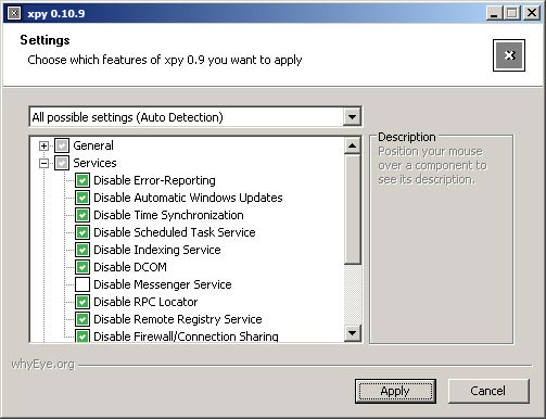 Обновилась версия бесплатной программы, которая помогает повысить безопасность и защищает от угроз, которые таит в себе стандартная инсталляция операционной системы Windows XP. Она закрывает доступ системе и ее компонентов к серверам Microsoft, удаляет программу Windows Messenger, не позволяет самовольно соединяться с Интернетом таким программа как: Internet Explorer, Windows Media Player, разным службам. Кроме этого, xpy отключает систему оповещений Windows Genuine Advantage, элементы ActiveX и JavaScript и многое другое. Эта версия xpy заменяет поиск Microsoft на Google Search. В данной версии исправлены ошибки, связанные с ServNetMeetingDesktop, с определением ServTelnet, а также с созданием точек отката. | |